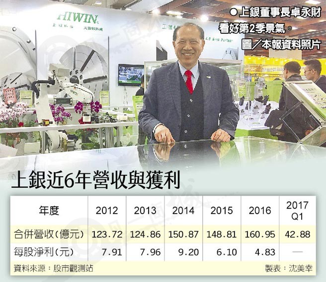 上銀集團董事長卓永財數度表示,他認為第2季景氣不錯,第3季景氣則是審慎樂觀。上銀上半年訂單爆滿,被客戶追著要貨,他擔心工具機廠重復下單而出現假性需求訂單,要求上銀業務單位下半年接單要保守,出貨優先供給忠誠度高的客戶。上銀轉投資陸聯精密機械去年11月至今年首季陸續接獲多臺傘齒輪機訂單,今年至少要損益兩平,甚至是轉虧為盈;大銀微系統今年營業額可從去年20億元提高至30億元。整體來看,上銀集團今年營運一定會超越去年。