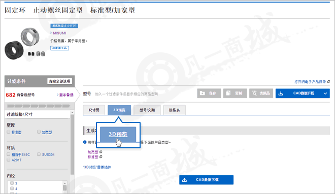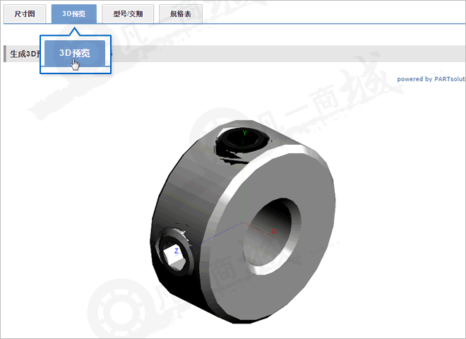 CAD、型號生成服務,可以通過指定類型、尺寸、材質等,自動生成想要的型號。點擊上部Tab菜單-3D預覽,將生成3D預覽。