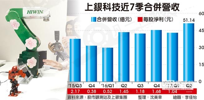 上銀三大主力商品滾珠絲桿、直線導軌及機器人,因全球力推工業4.0,對智慧自動化設備需求殷切,智慧自動化需要用到滾珠絲桿及直線導軌等關鍵零組件,加上全球景氣逐步回升,尤其今年大陸、歐洲及日本等地市場需求持續成長,帶旺6月合并營收攀升至17.71億元,年增加14.55%,續創單月營收新高;第2季合并營收51.14億元,年增18.15%,創單季營收高;上半年合并營收高達94.02億,也創同期新高,表現優于市場預期。
