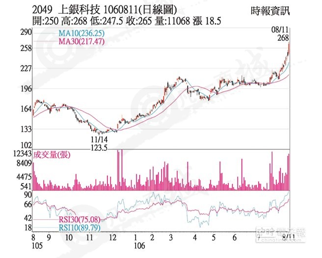 上銀科技(2049)7月合并營收,締造連續(xù)第5個月單月新高佳績,法說會報喜訊,明年首季訂單滿載,外資法人相繼調(diào)高目標價從235-315元不等,還調(diào)升評等至優(yōu)于大盤,11日成交爆大量,開高走高,逆勢上漲18.5元以265元收盤,創(chuàng)2015年4月以來新高。