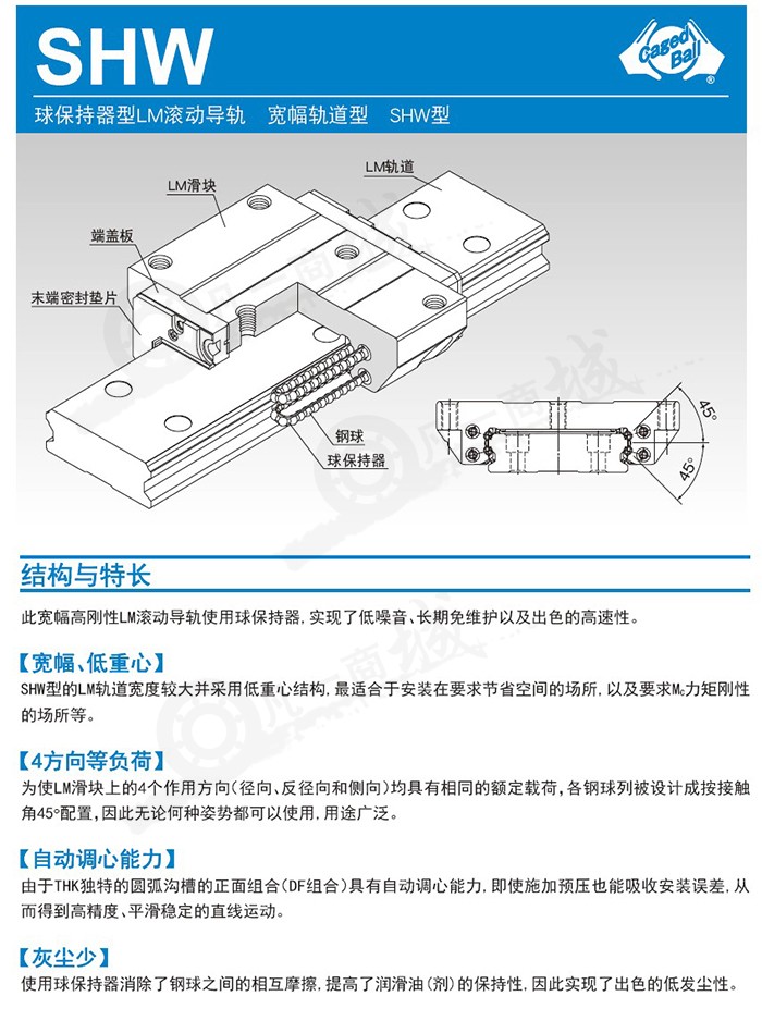 (寬幅低重心):SHW型的LM軌道寬度較大并采用低重心結構,最適合安裝在要求節省空間的場所,以及要求M力矩剛性的場所的等